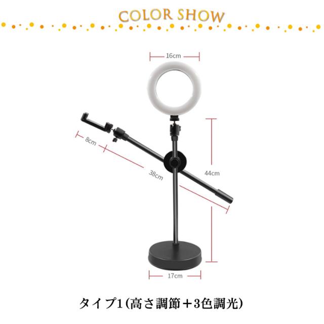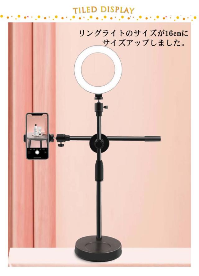 | 手元を映すの俯瞰撮影スマホスタンド【16cmリングライト付き】 リングライトのサイズが16cmにサイズアップしました。この俯瞰スマホスタンドは卓上で使いやすい卓上タイプです。手元撮影をしたい方や、アクセサリーやネイルの仕上がりの撮影などを上から撮影する方などにピッタリのスマホスタンドです。 【どんな角度にも調整可能】360度の角度調整が可能で、たったの2秒で横、縦、斜め、上下、変幻自在に好きな位置にスマホをセットできます。照明ライトの角度も自由に調整できるので、撮影時にスマホへの映り方を調整しながら撮影することができます。 【3色調光9段階調整のリングライト付き】撮影用にLEDのリングライトが付いています。3色の調光と9段階調整ができ、物撮り、俯瞰撮影、動画撮影、youtubeの撮影、手元撮影、などあらゆるシーンで活躍します。また、zoomミーティングなどのオンライン会議でも、あなたの顔をさらに明るく映しだすことができます。SNS、TikTok、インスタグラムなど、このスマホスタンドで撮影した写真や動画をどんどんアップして魅力的な写真を投稿しちゃいましょう♪ 【電源は便利なUSB仕様】電源はUSBコンセント、デスクトップ、ノートPC、モバイルバッテリーなどから給電できる便利なUSB仕様となっております。場所を選ばず撮影ができます。使用の際は電源コードを強く引っ張らないようご注意ください。 | |