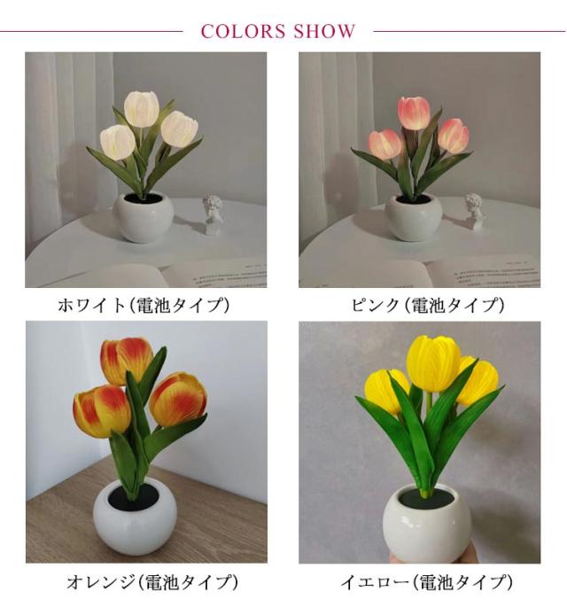 | 夜も昼もかわいいチューリップLEDライト 本物のお花そっくりのLEDフラワーライトです。昼はアートフラワーとして夜はムードライトとしてお部屋を彩ります。 まるで本物のお花のように1つ1つ丁寧に作られた花びらが特長。アートフラワーなので、枯れることなく永く上品な姿を楽しむことが出来ます。 セラミックスの鉢付きなので、届いたらそのままお使い頂けます。 電池式なので飾る場所も選ばません。玄関・寝室・リビングお好きな場所でお楽しみください。 大切な方へのプレゼントとしても喜んでいただけます。 | |
