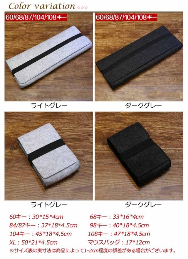 | サイズについての説明 | 60キー:30*15*4cm 68キー:33*16*4cm 84/87キー:37*18*4.5cm 98キー:40*18*4.5cm 104キー:45*18*4.5cm 108キー:47*18*4.5cm XL:50*21*4.5cm マウスバッグ:17*12cm ※サイズ表の実寸法は商品によって1-2cm程度の誤差がある場合がございます。 |