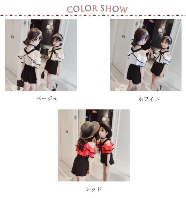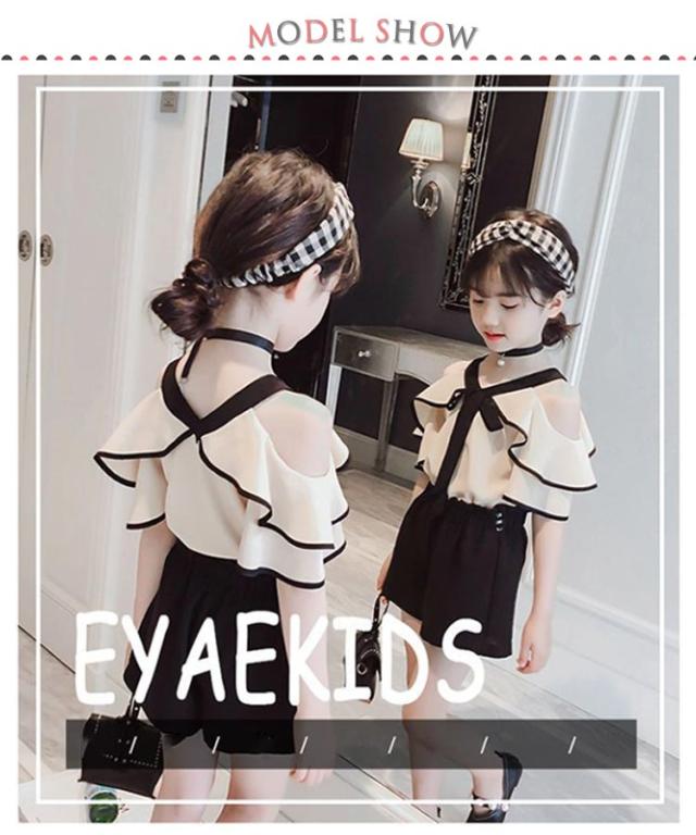女の子 セットアップ 肩出し ブラウス ブラック ショートパンツ ホワイト モノトーン 半袖 トップス フリルスリーブ 夏 夏服 キッズ 肩だし ジュニア 2点セット 上下セット 韓国 子ども服 韓国こども服 韓国子供服 大人っぽい 送料無料