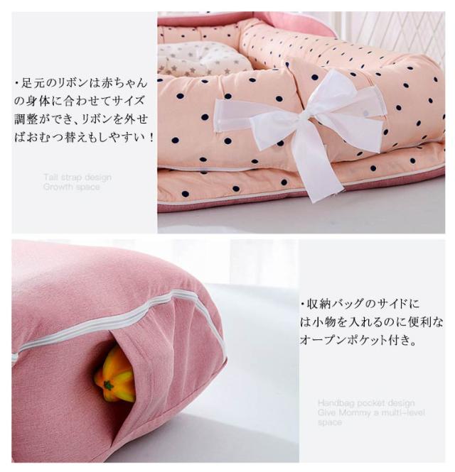 | ・大人用ベッドで赤ちゃんが寝るスペースを確保できるベッドインタイプのベビーベッド! ・パパやママの寝返りでぶつかったり、ベッドからの落下防止に役立つ。 ・通気性、手触りが良い綿素材を使用しているから、肌がデリケートな赤ちゃんも安心◎ ・赤ちゃんの体の負担を軽減してくれる厚さのマットレス。 ・包み込む構造にもなっており快適な寝心地に。 ・赤ちゃんの頭にちょうど良い枕も付属! ・ベッドと収納バッグ一体型のデザインで使わないときは折りたたむだけで収納可能♪ ・収納バッグのサイドには小物を入れるのに便利なオープンポケット付き。 ・足元のリボンは赤ちゃんの身体に合わせてサイズ調整ができ、リボンを外せばおむつ替えもしやすい! ・さらに持ち手とショルダーベルトも付いており持ち運びに便利! ・家での使用はもちろん、お出かけや帰省に便利です! ・『折りたたみ式&軽量』で移動もラクラク♪ | |
