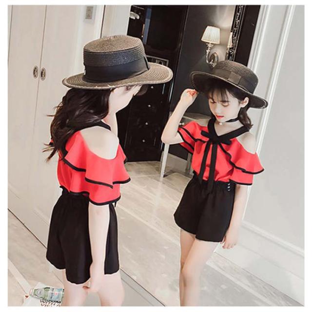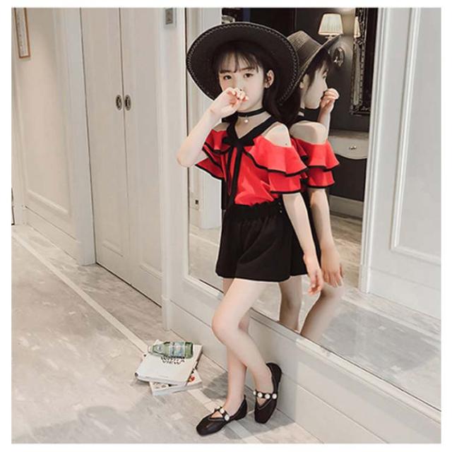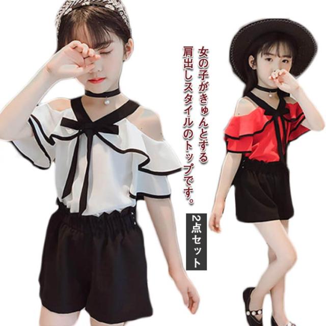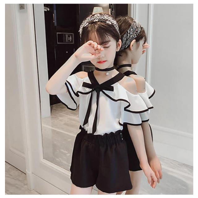 女の子 セットアップ 肩出し ブラウス ブラック ショートパンツ ホワイト モノトーン 半袖 トップス フリルスリーブ 夏 夏服 キッズ 肩だし ジュニア 2点セット 上下セット 韓国 子ども服 韓国こども服 韓国子供服 大人っぽい 送料無料
