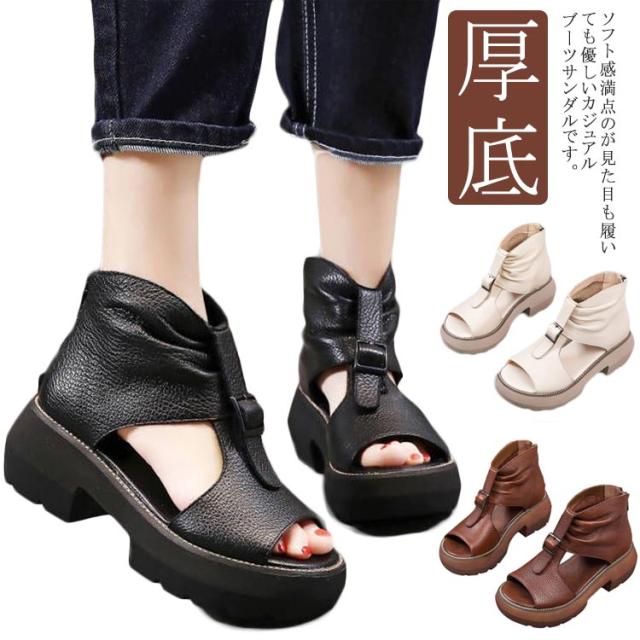 オープントゥ ブーツサンダル レディース 厚底サンダル ショートブーツ フラットシューズ 厚底シューズ ペタンコ コンフォート サマーブーツ 春 夏用 通気性 カジュアル 美脚 靴 パンプス オシャレ ブラック ベージュ ブラウン