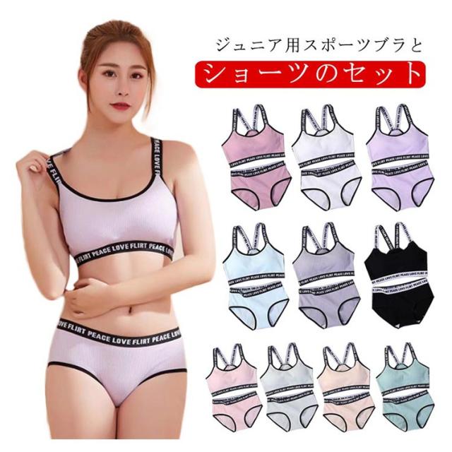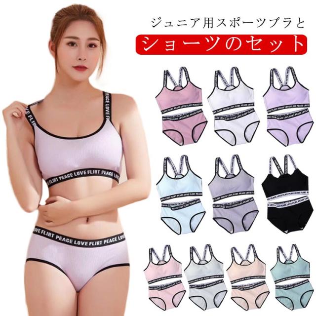 女の子 ファーストブラ ジュニア ブラジャー ブラ ショーツ セット ジュニア向け スポーツブラとショーツ 上下セット カップ付き 子供用 インナー 肌着 綿 学生 アンダーウェア 中学生 肩ひもロゴ ロゴテープ 下着