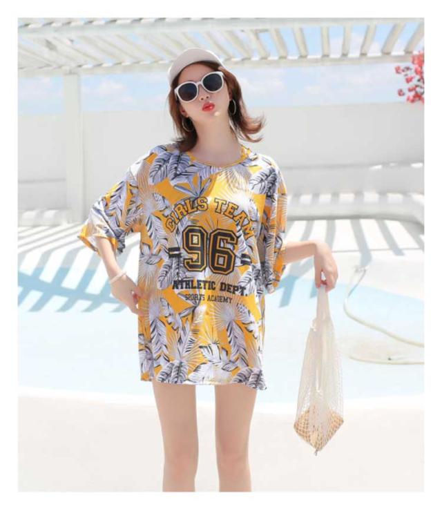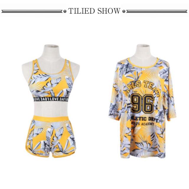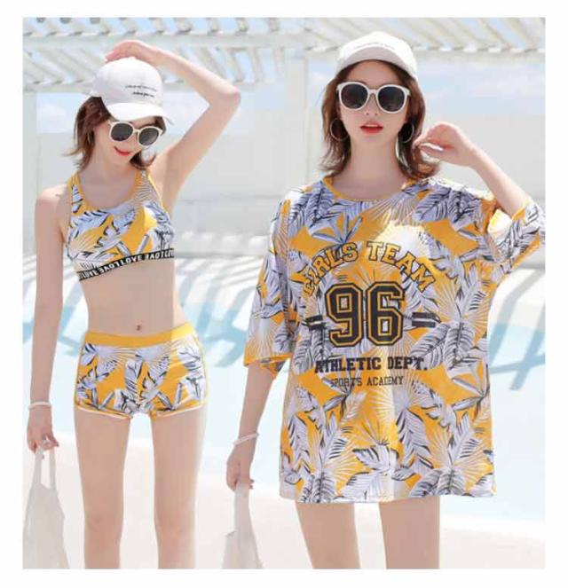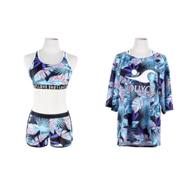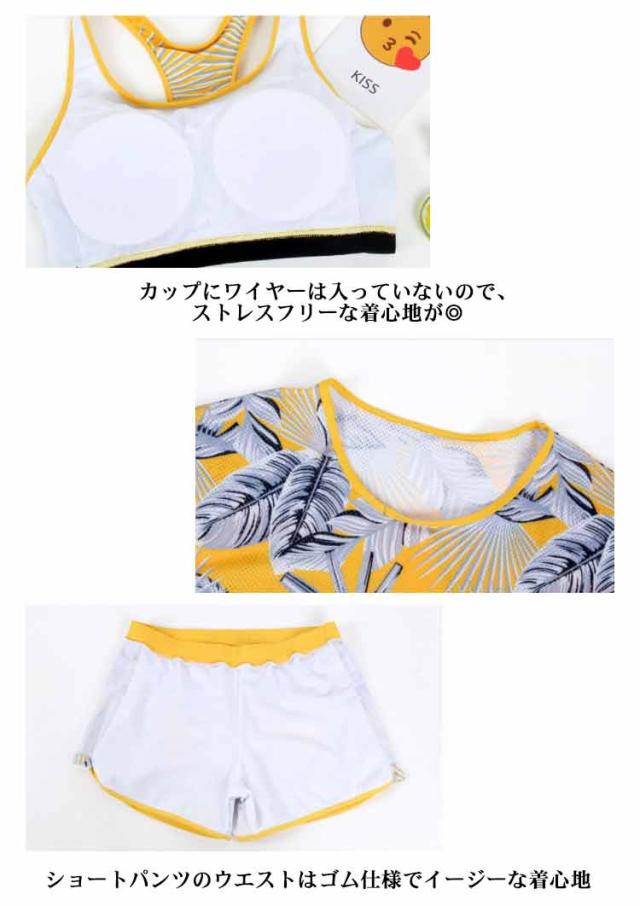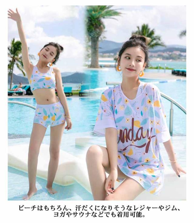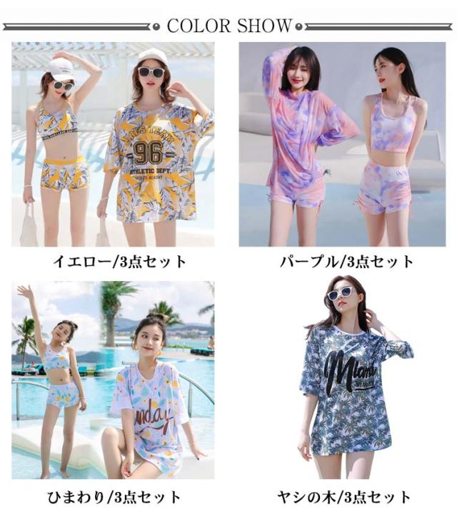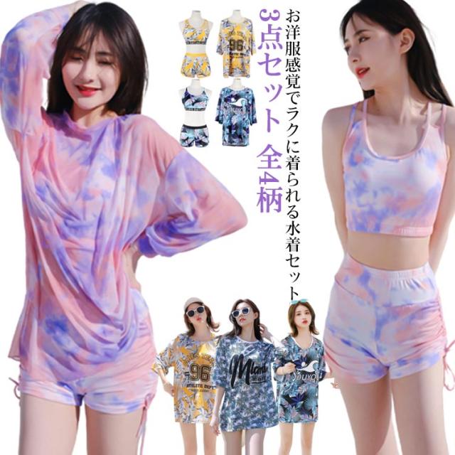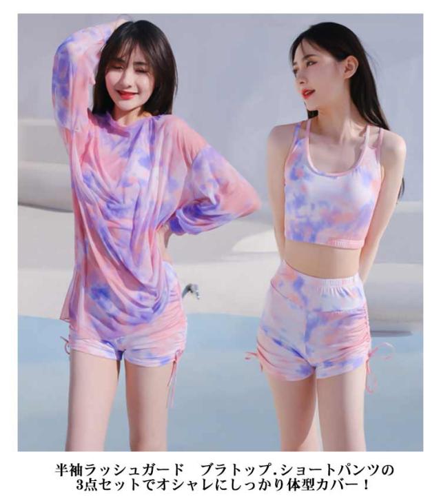 水着 レディース 3点セット ラッシュガード 半袖 女子 体型カバー 高校生 中学生 メッシュ パッド入り ノンワイヤー スポーティー 学生 可愛い 植物 花柄 タイダイ柄 全4柄