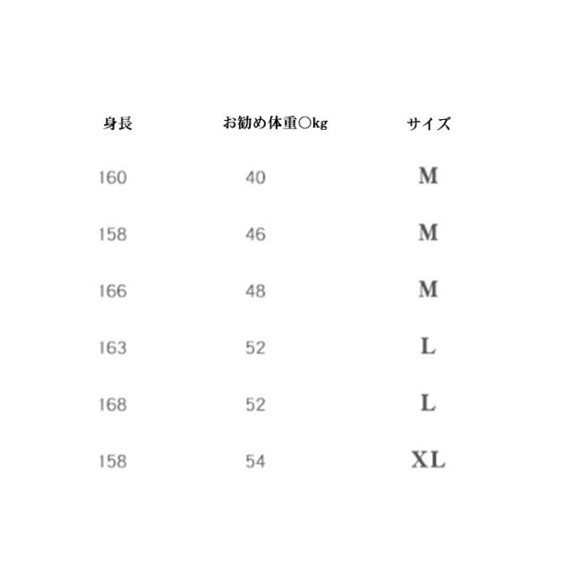 | サイズについての説明 | 【サイズ】 【M】 目安体重40〜48kg 目安身長160〜166cm 【L】 目安体重52kg 目安身長163〜168cm 【XL】 目安体重54kg 目安身長168〜174cm ※上記サイズは平置き実寸になります。 サイズ表の実寸法は商品によって1-3cm程度の誤差がある場合がございます。 |
