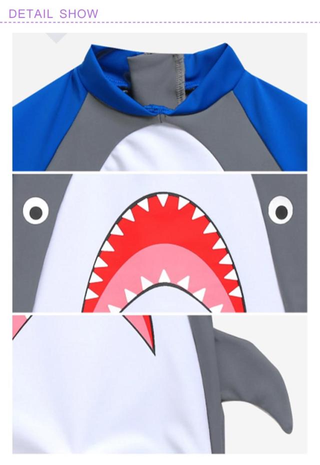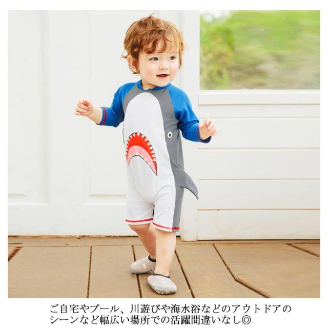 | 肩や首の日焼け対策♪サメがデザインされたとってもかわいいベビー水着。 お腹がはだける心配が不要なロンパースタイプの水着は、活発でわんぱくなお子様にピッタリ☆ 長袖でお肌をカバーするのでラッシュガードとしての役割も担います。 上下つながったオールインワンタイプ、ひざ丈なので水の中でも動きやすい! 伸縮性に優れた生地を使用しているので、お子様の元気な動きを邪魔しない!着心地もGOOD。 海辺やプールサイドで周囲の注目の的になれること間違いありません! | |
