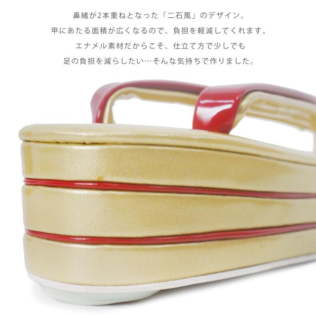 硬いエナメル素材だからこそ、仕立てで足に優しい草履となるように作りました。