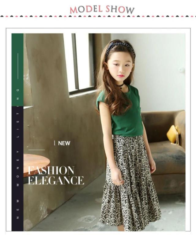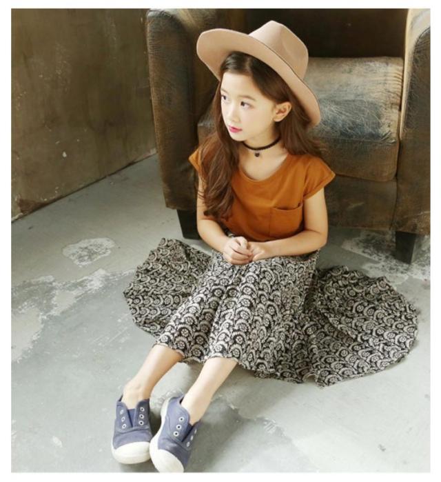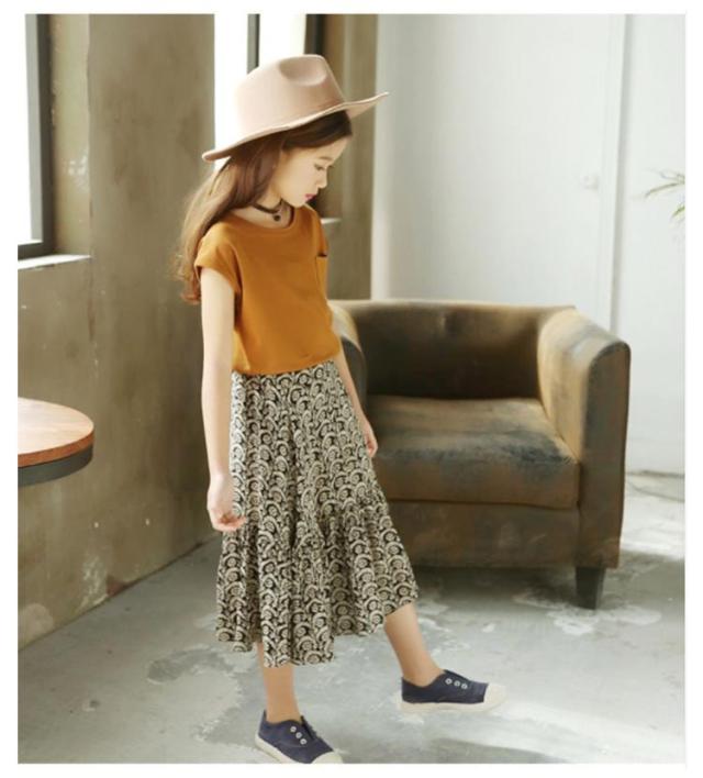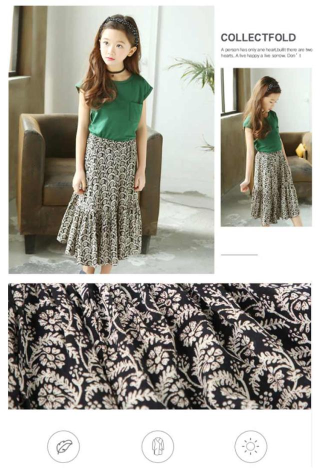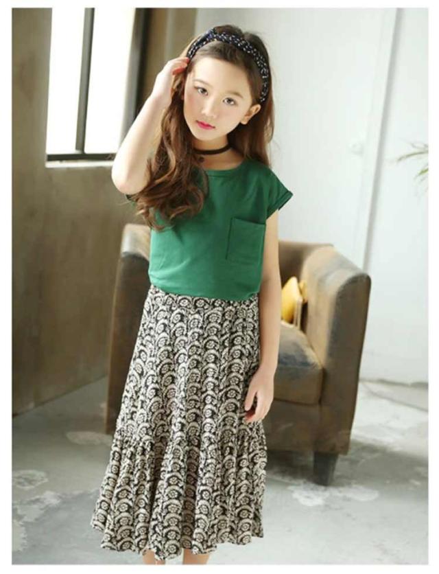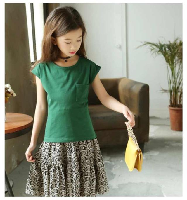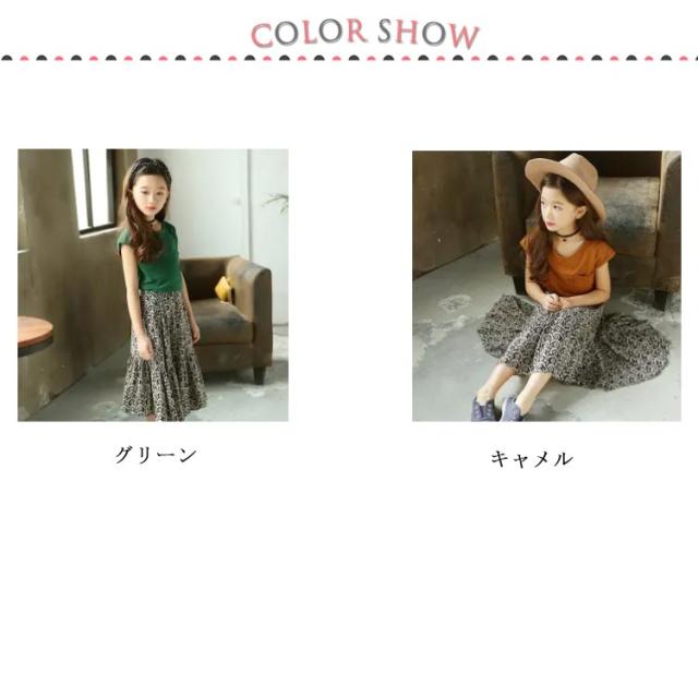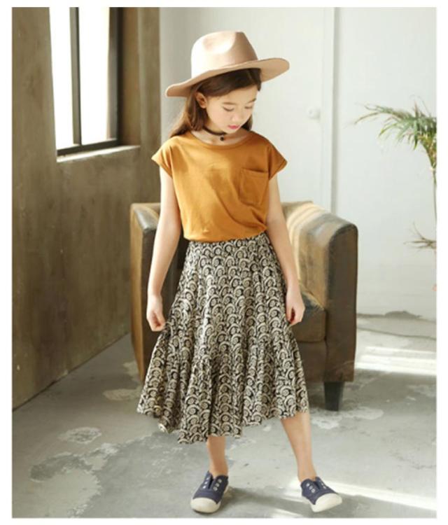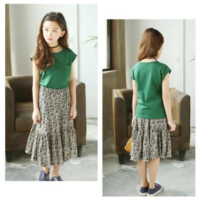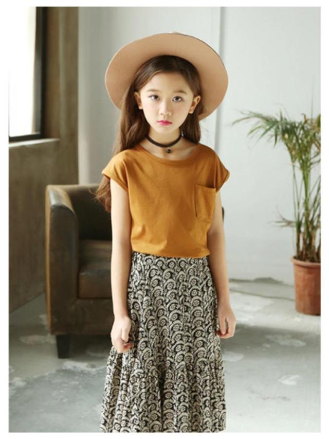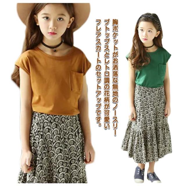ノースリーブトップス フレア 胸ポケット キッズ服 女の子用 2点セット スカート ノースリーブ 子供服 カットソー トップス ラウンドネック フレアスカート 可愛 ロング丈 上下セット ウエストゴム ギャザー 花柄 レトロ調 夏 セットアップ