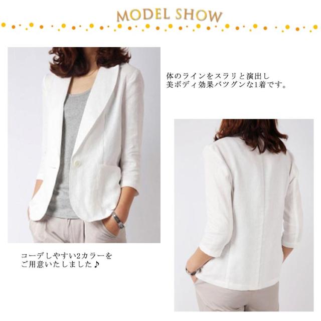 | 【 全3色×6サイズ 】 リネンを使用したナチュラルな印象を与えてくれるテーラードジャケット。 体のラインをスラリと演出し美ボディ効果バツグンな1着です。 コーデしやすい2カラーをご用意いたしました♪ | |
