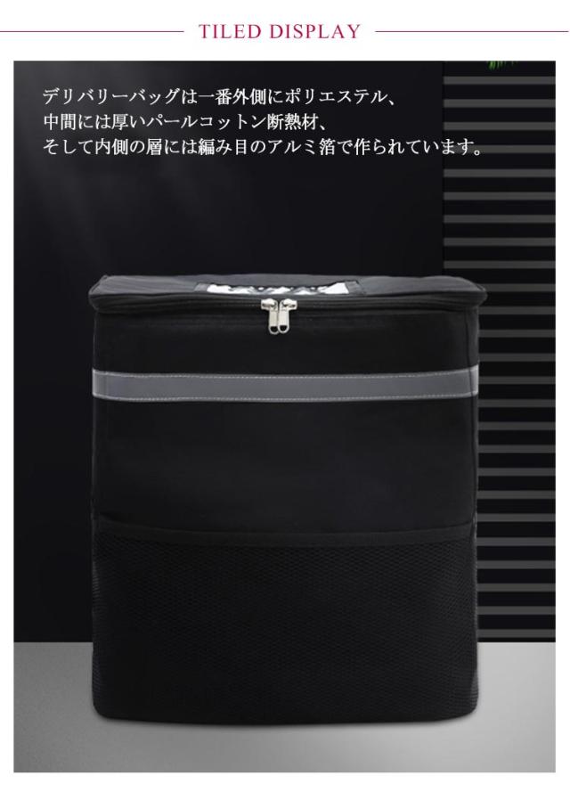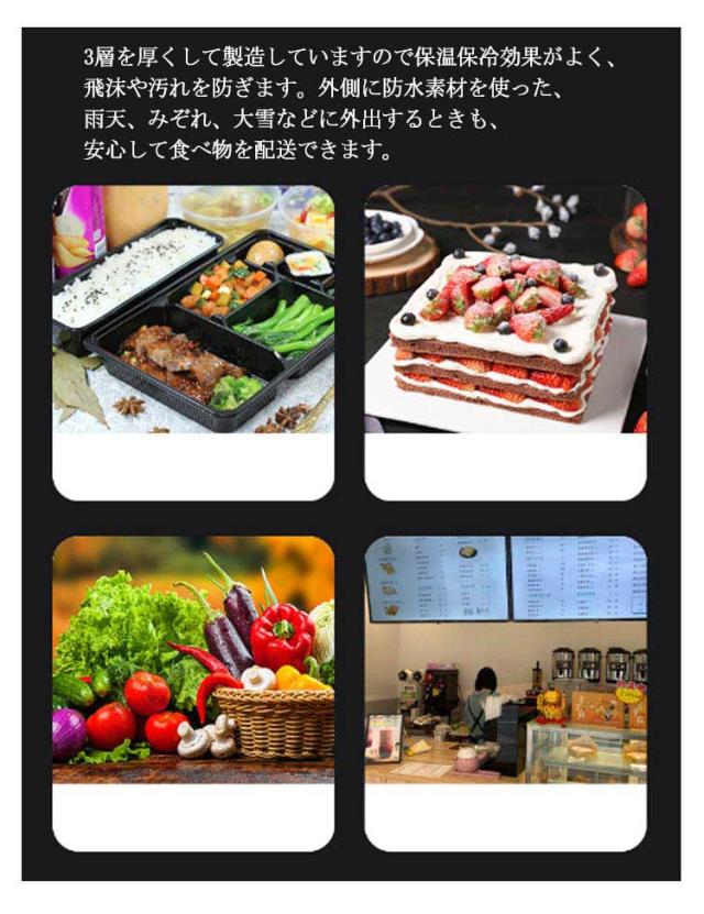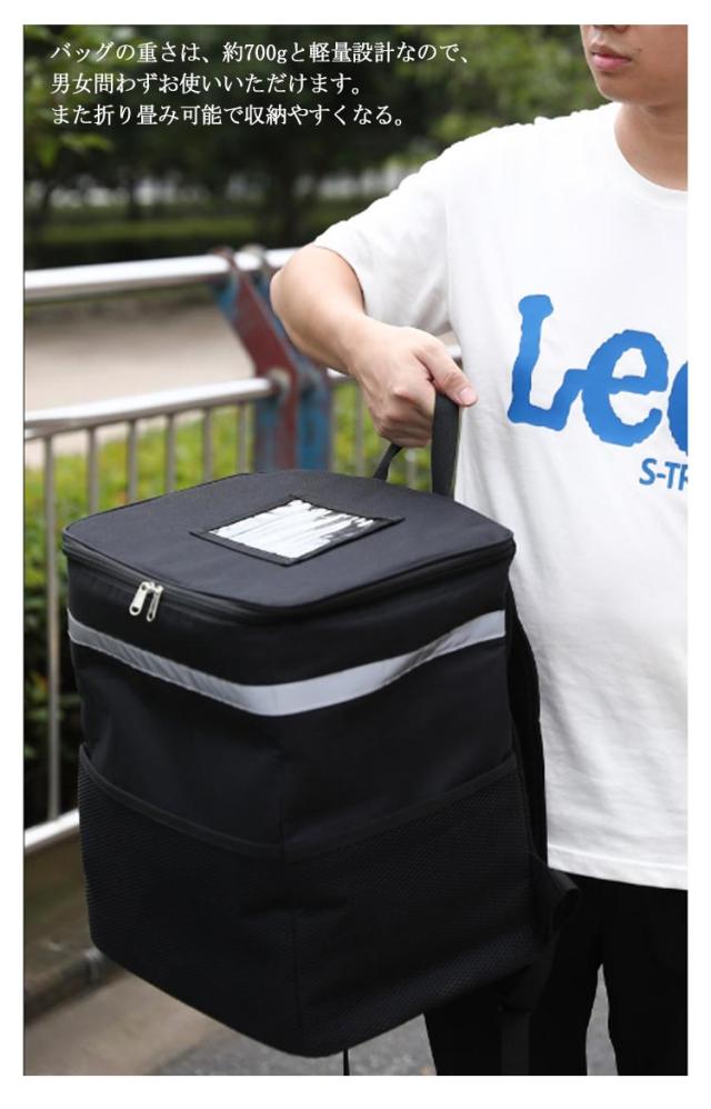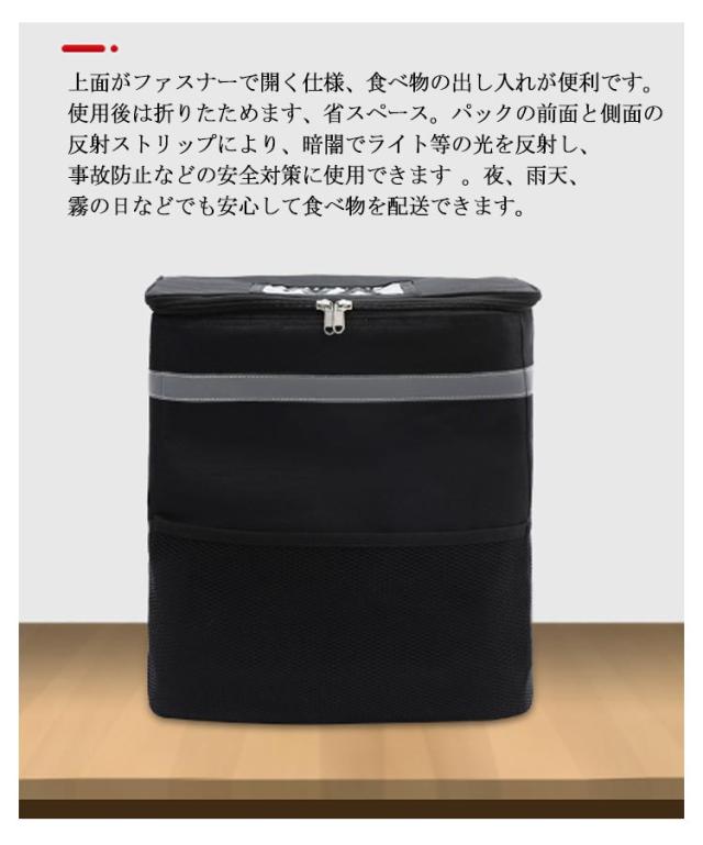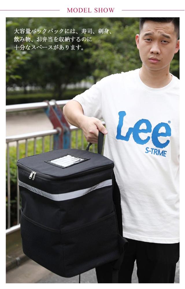 | 2タイプ選べる! 保温・保冷 、配達に最適なデリバリーバッグ。 【保温保冷力抜群】デリバリーバッグは一番外側にポリエステル、中間には厚いパールコットン断熱材、そして内側の層には編み目のアルミ箔で作られています。 3層を厚くして製造していますので保温保冷効果がよく、飛沫や汚れを防ぎます。外側に防水素材を使った、雨天、みぞれ、大雪などに外出するときも、安心して食べ物を配送できます。 【ラクに背負える】大き過ぎることなく、ちょうど良いサイズです。しっかり安定した形でたっぷり収納できます。 チェストストラップ付き!よいバランスの安定感を与え、肩と腰の疲れも和らげます重いリュックがラクに背負える!女性も無理なく持てます!そこまで重くなく、荷物もたくさん入ります!自転車配送員の方には超お勧めです。 【実用性が強い】両サイドと前面にポケットあり、小さい小物など収納できます。フタ面に透明ポケットにお店のチラシやメニューなどいれます。 上面がファスナーで開く仕様、食べ物の出し入れが便利です。使用後は折りたためます、省スペース。パックの前面と側面の反射ストリップにより、暗闇でライト等の光を反射し、事故防止などの安全対策に使用できます 。夜、雨天、霧の日などでも安心して食べ物を配送できます。 【35L大容量&700g軽量】大容量バックパックには、寿司、刺身、飲み物、お弁当を収納するのに十分なスペースがあります。 バッグの重さは、約700gと軽量設計なので、男女問わずお使いいただけます。また折り畳み可能で収納やすくなる。 | |