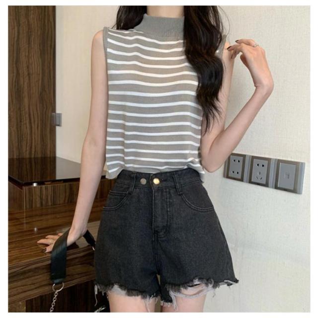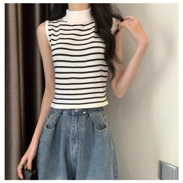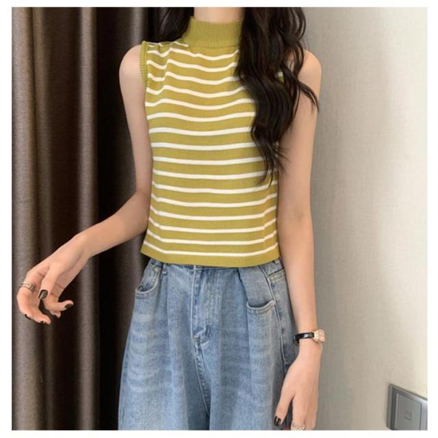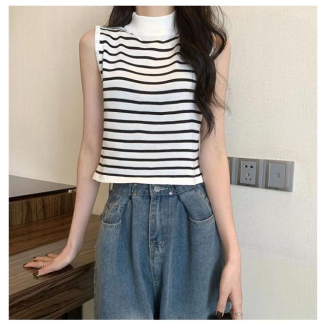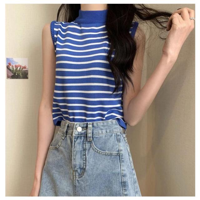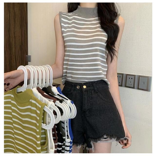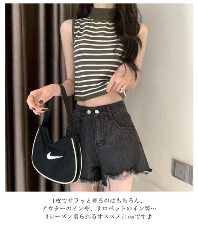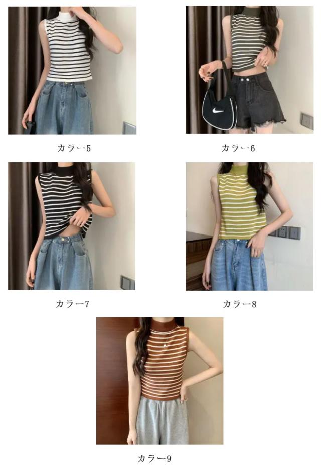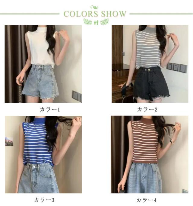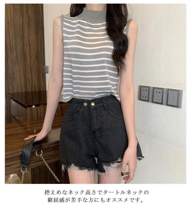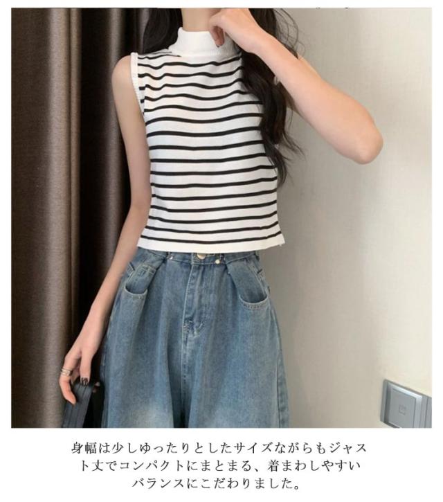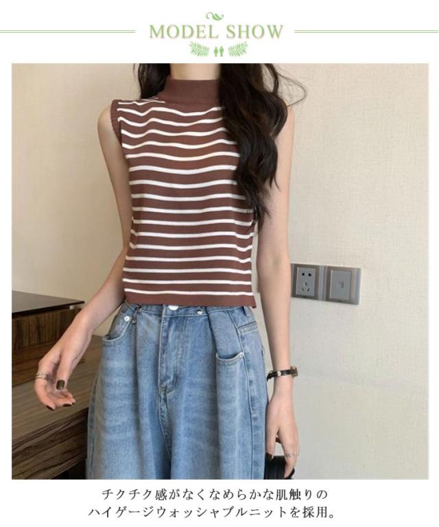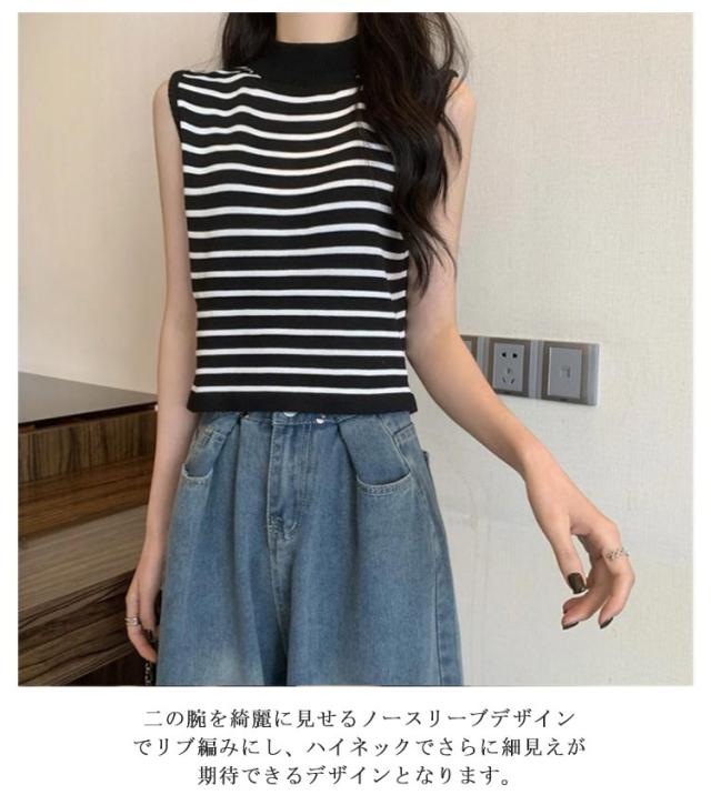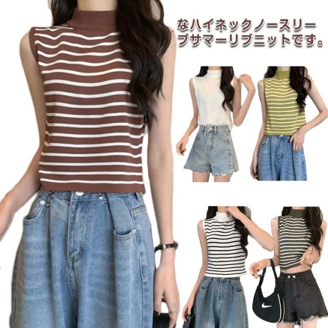 【送料無料】サマーニット ノースリーブ レディース トップス ハイネック ボーダー ハイネックニット リブ カットソー タンクトップ 肩開き 肩だし インナー シルクタッチ 体型カバー きれいめ おしゃれ 通勤 オフィス