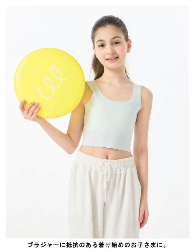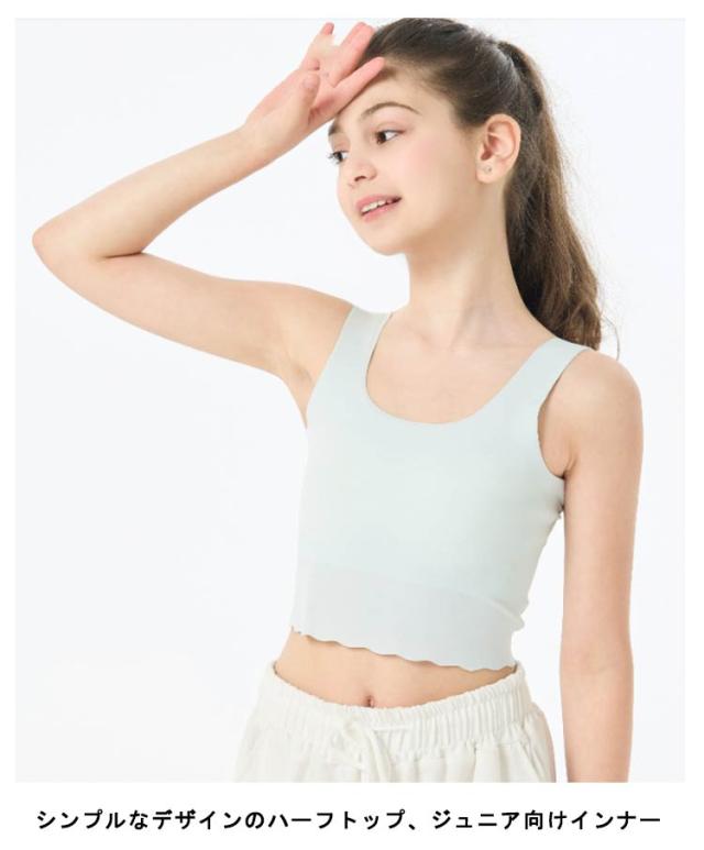 | シンプルなデザインのハーフトップ、ジュニア向けインナー 肩に負担がかかりにくい ストラップは安定感のある幅広タイプ。 成長中のバストをやさしく支えるノンワイヤータイプ。 ブラジャーに抵抗のある着け始めのお子さまに。 生地は吸汗速乾性素材を使用しているので、さらっとした肌あたりです。 | |