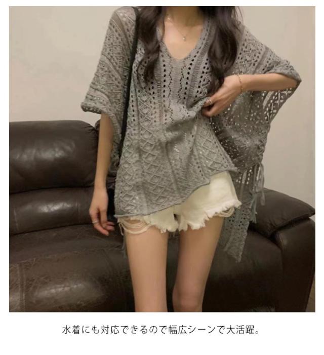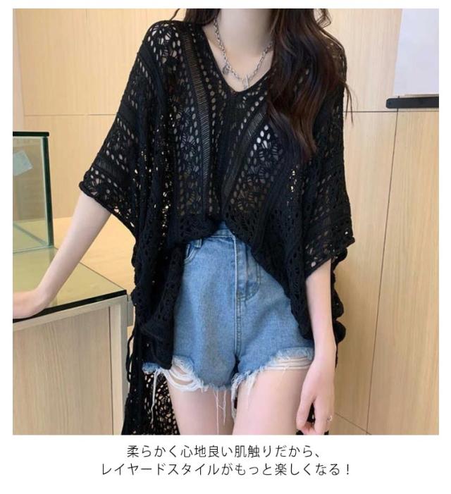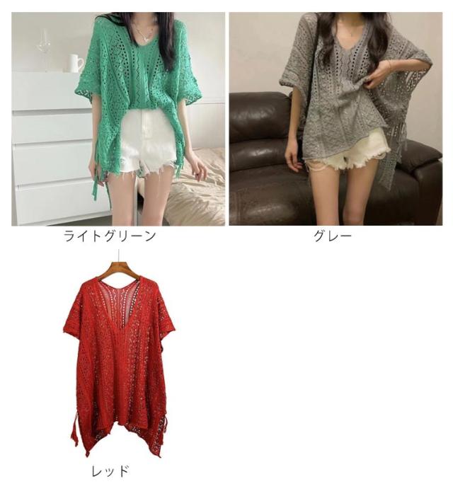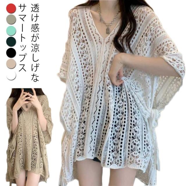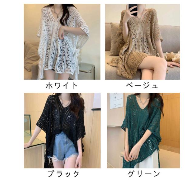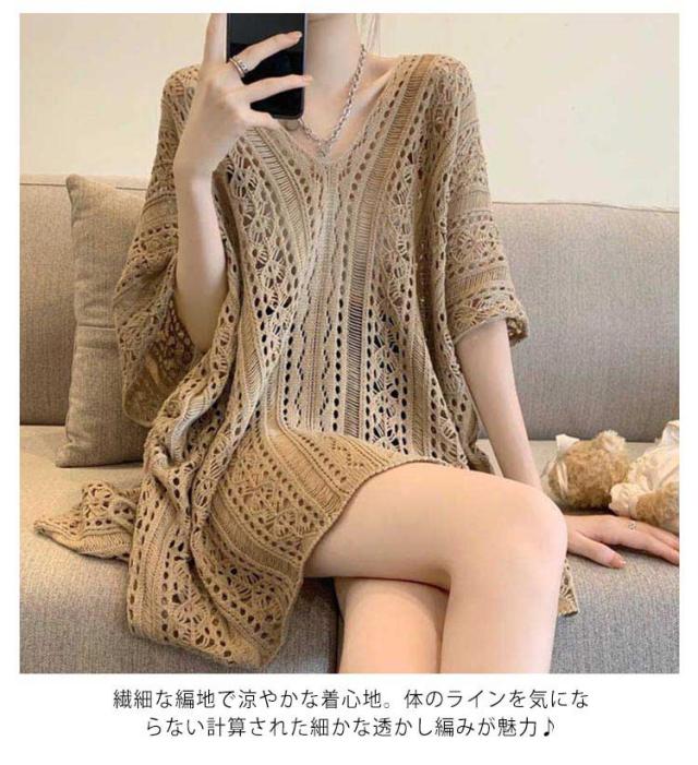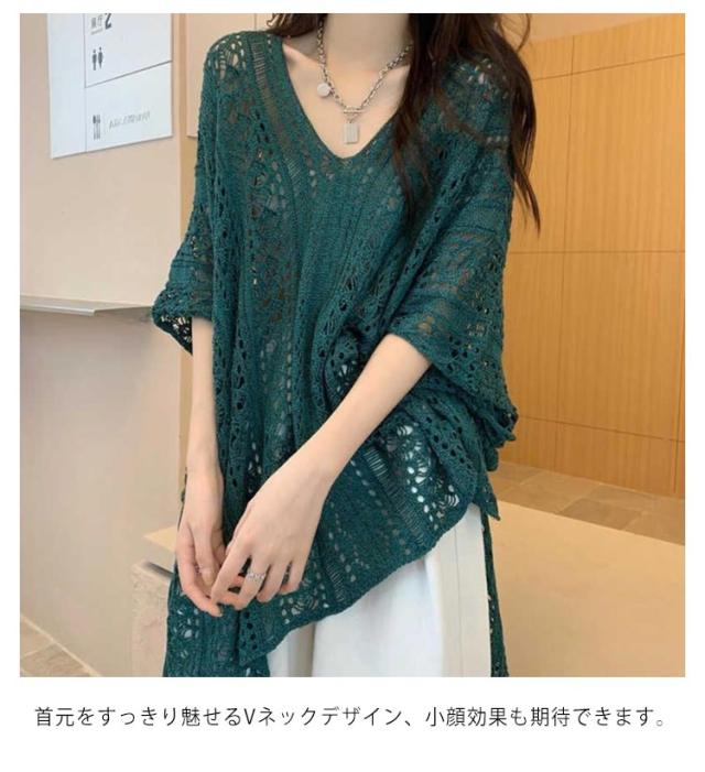 ニット 透かし彫り 透け感 薄手 ギフト 透かし編み Vネック アウター レディース ゆったり レイヤード 重ね着 トップス プルオーバー 春 夏 フリーサイズ おしゃれ カジュアル 無地 お洒落 可愛い サマー 体型カバー 水着カバー ロング丈