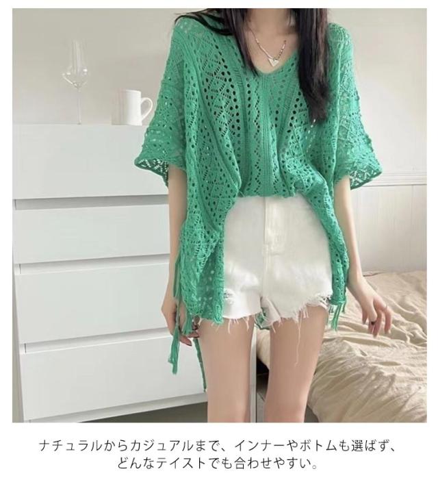 | 透け感が涼しげなサマートップス 繊細な編地で涼やかな着心地。体のラインを気にならない計算された細かな透かし編みが魅力♪ 柔らかく心地良い肌触りだから、レイヤードスタイルがもっと楽しくなる! 首元をすっきり魅せるVネックデザイン、小顔効果も期待できます。 ナチュラルからカジュアルまで、インナーやボトムも選ばず、どんなテイストでも合わせやすい。 水着にも対応できるので幅広シーンで大活躍。 | |