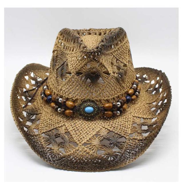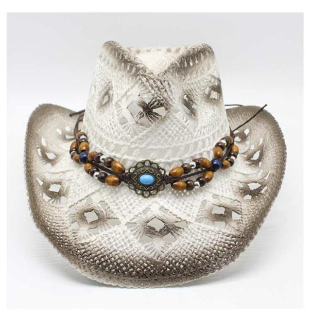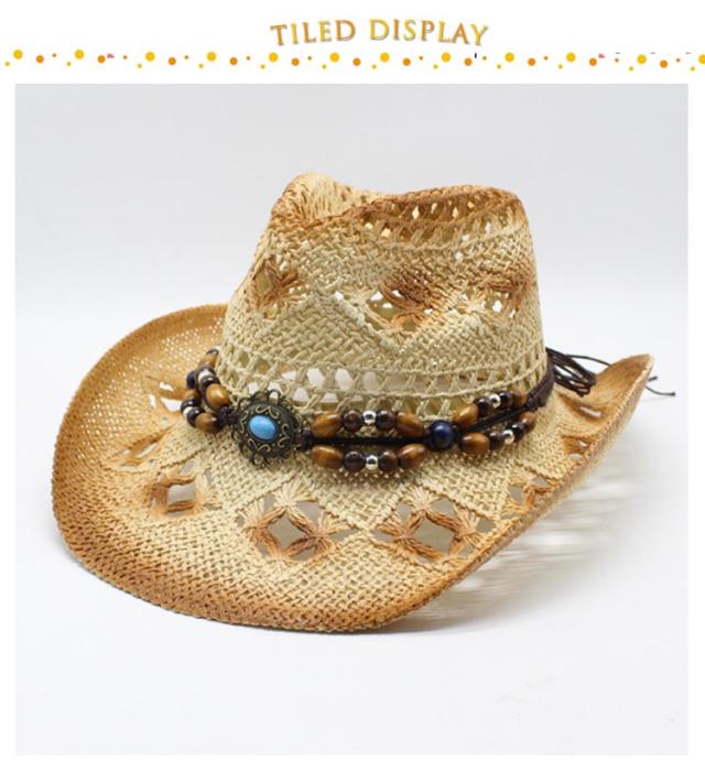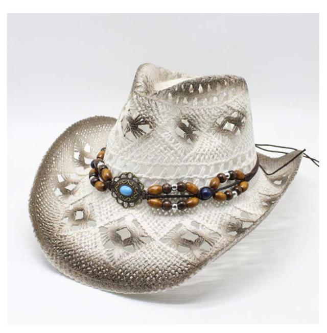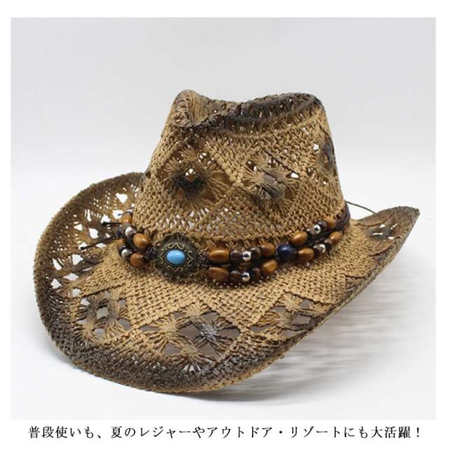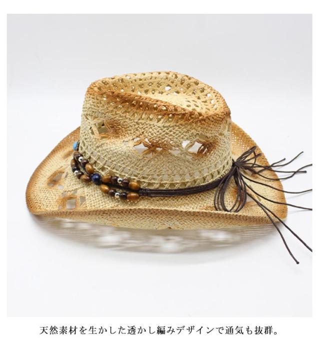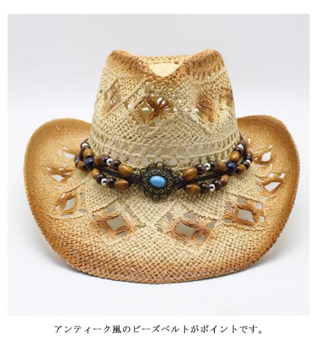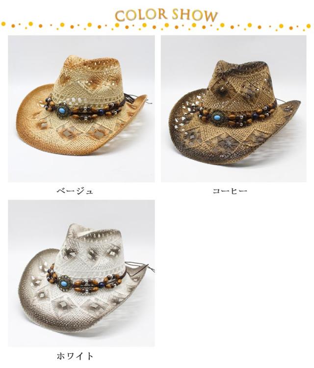 | 夏らしい麦わら素材でできたテンガロンハット。 アンティーク風のビーズベルトがポイントです。 天然素材を生かした透かし編みデザインで通気も抜群。 普段使いも、夏のレジャーやアウトドア・リゾートにも大活躍! | |