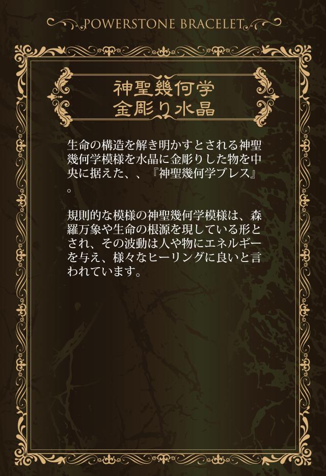 生命の構造を解き明かすとされる神聖幾何学模様を水晶に金彫りした物を中央に据えた『神聖幾何学ブレス』