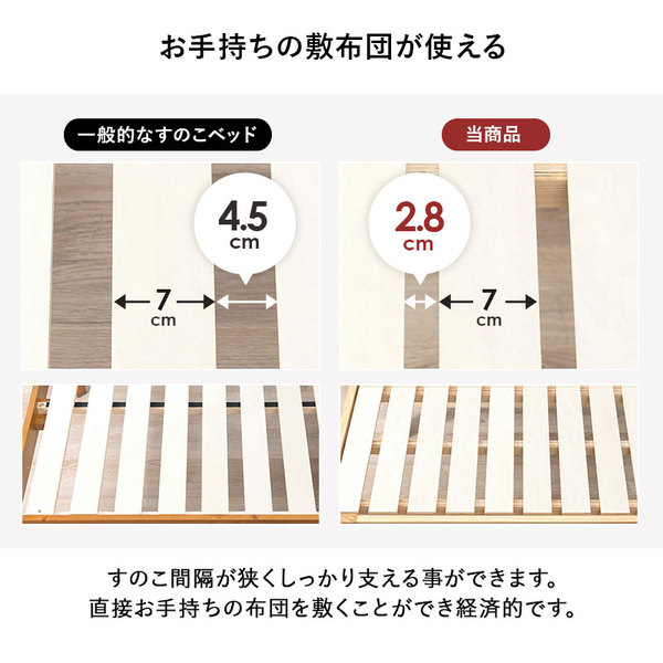 敷布団がそのまま使えるロングサイズ。天然木を贅沢に使用した頑丈な造りのすのこベッド。