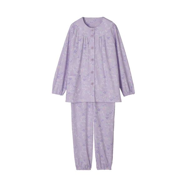 ●つかみやすい大きめボタンの女性用パジャマ。パープルのMサイズ。
