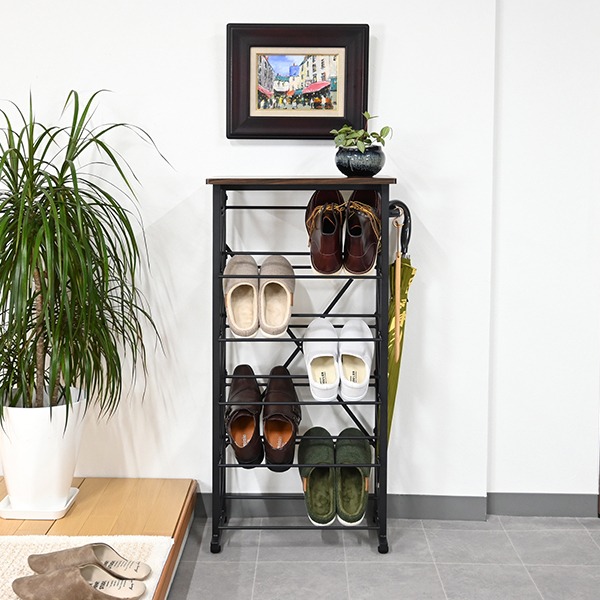 奥行きがたったの25cmしかないので、玄関で場所をとりません。オープンタイプのシューズラックは、風通しが良いので湿気もこもらず通気性抜群です。靴を斜めに収納するタイプなので、出し入れがしやすいのが魅力です。ガタつき防止のアジャスター付きで、傘掛けも付いていて便利です。