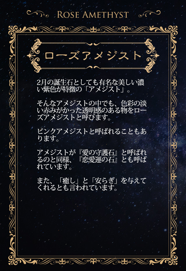 そんなアメジストの中でも、色彩の淡い赤みがかった透明感のある物をローズアメジストと呼びます。