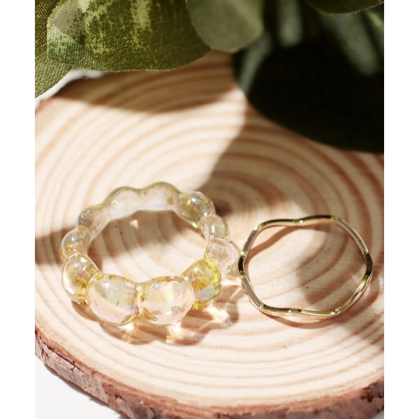 オーロラカラーがかわいいバブルデザインのアクリルリングと、ウェーブがこなれ感のあるメタルリングのお得なセットアイテム。