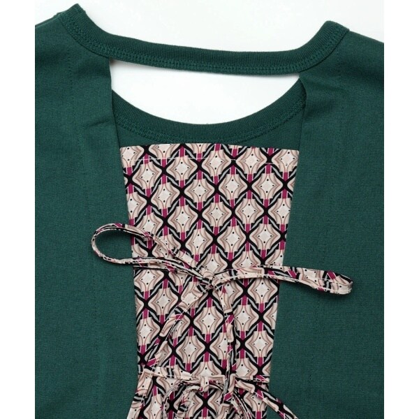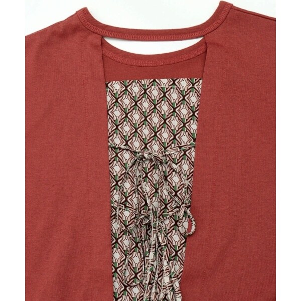 背中でさりげなく個性を放つ落ち着きカラーの幾何学柄に、リボンをプラスしたデザイン。