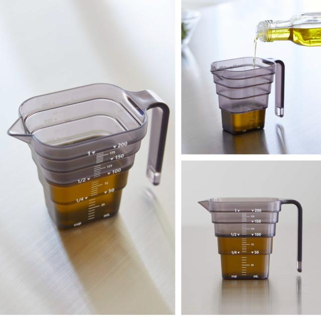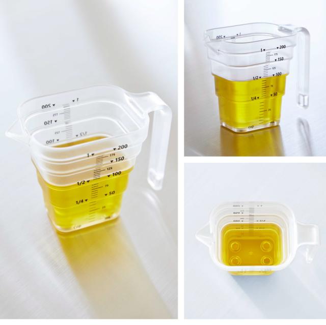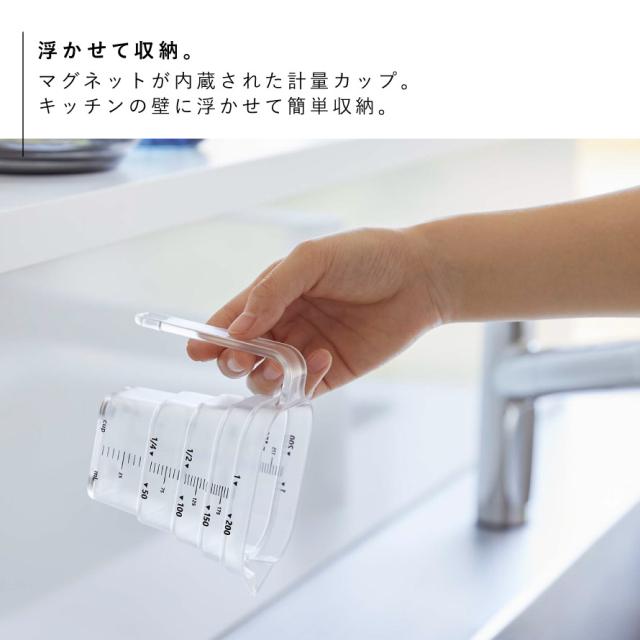 マグネットで浮かせて収納!段差メモリで使いやすい計量カップ。マグネットが内蔵された計量カップ。キッチンの壁に浮かせて簡単収納できます。水切れもよく衛生的です。