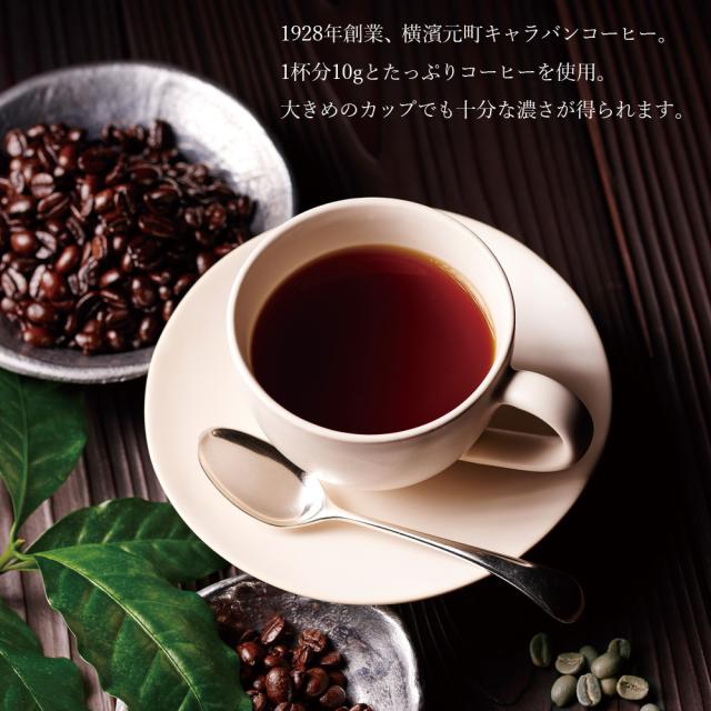 1928年創業、横濱元町キャラバンコーヒー。1杯分10gとたっぷりコーヒーを使用、大きめのカップでも十分な濃さが得られます。