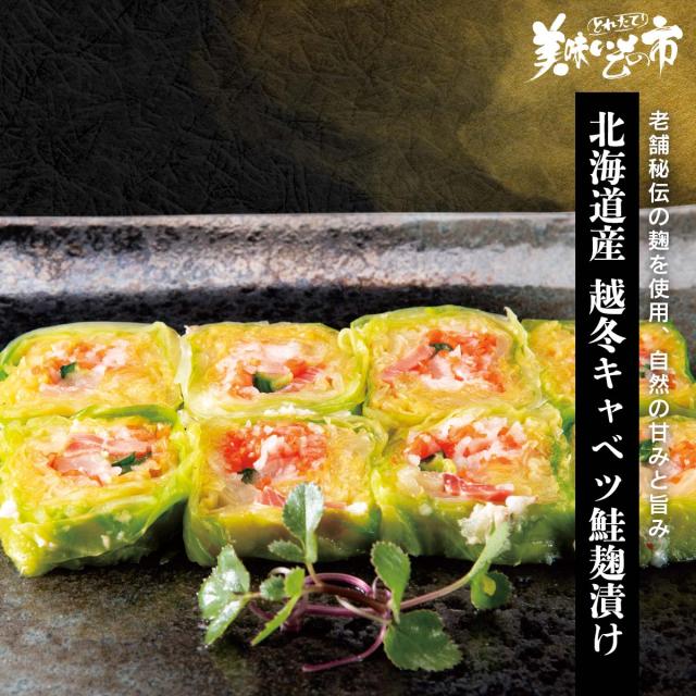 北海道産の新鮮で甘みが自慢の越冬キャベツで、食感の良い野菜と山漬けした北海道の秋鮭を丁寧に包んだ麹漬けです。