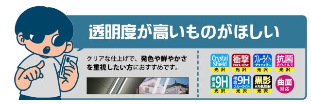 Crystal Shield【光沢】/ 衝撃吸収【光沢】/ ブルーライトカット【光沢】/ 抗菌 抗ウイルス【光沢】/ 9H高硬度【光沢】/ 9H高硬度【ブルーライトカット】/ 黒影【AR低反射・光沢】/ Flexible Shield【光沢】