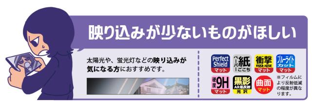 Perfect Shield【反射低減】/ Perfect Shield Plus【反射低減】/ 衝撃吸収【反射低減】/ ブルーライトカット【反射低減】/ 9H高硬度【反射低減】/ Flexible Shield Matte【反射低減】/ 純黒クリア【超反射防止】