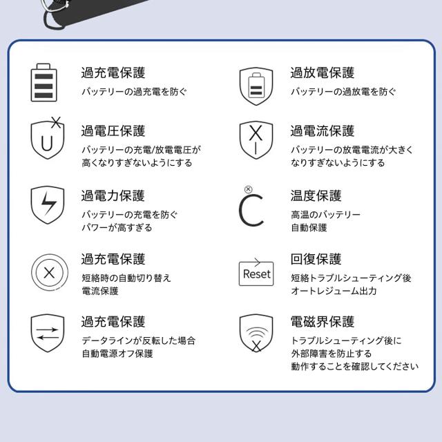 【コアチップの保護】本体はショート保護、逆接続保護、低電圧保護、高電圧保護、荷充電保護などの保護機能が搭載しているので、長期使用を保障します。