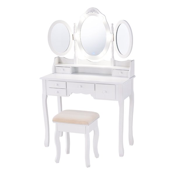 LEDの女優ライト付きのドレッサー。三面鏡タイプ。上品な曲線脚のデザインを合わせたスツール付き