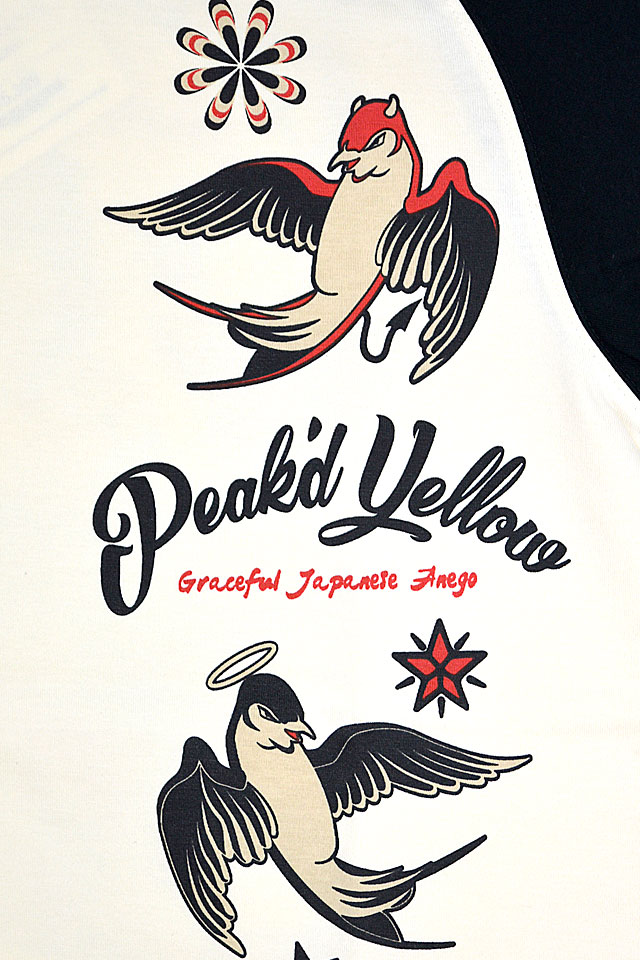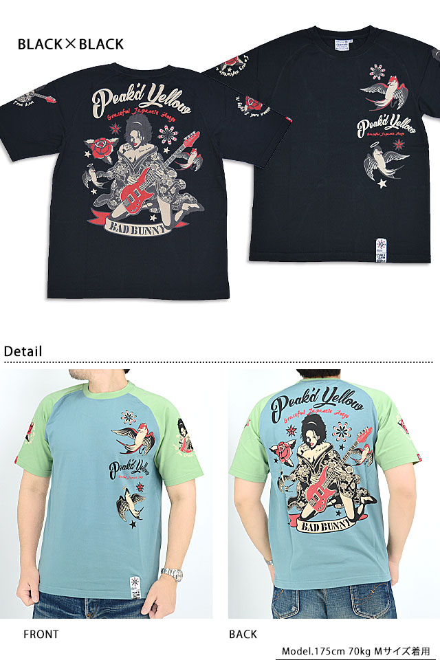 「トンガった日本人」をブランドネーミングに掲げ、オリエンタルビューティーの世界観を作品に封じ込めるピークドイエローから「TATTOO半袖Tシャツ(PYT-236)」のご紹介です! ベースを手にした姉御の周りにタトゥー・モチーフがプリントされたデザインの半袖Tシャツです。 背中には、ギターを奏でる着物姿の姉御をプリントしました。 フロント左胸には、天使と悪魔に扮したツバメを配置。 右袖にはローズを、左袖には姉御をそれぞれプリントで落とし込みました。 生地はストレッチのきいた、さらりとしたものを使用。 また、今回は肩の切り替えのないラグランボディーを採用し、スポーティーに仕上げました。 | ||||||||||||||||||||
