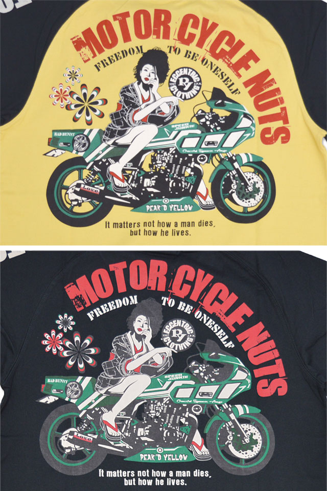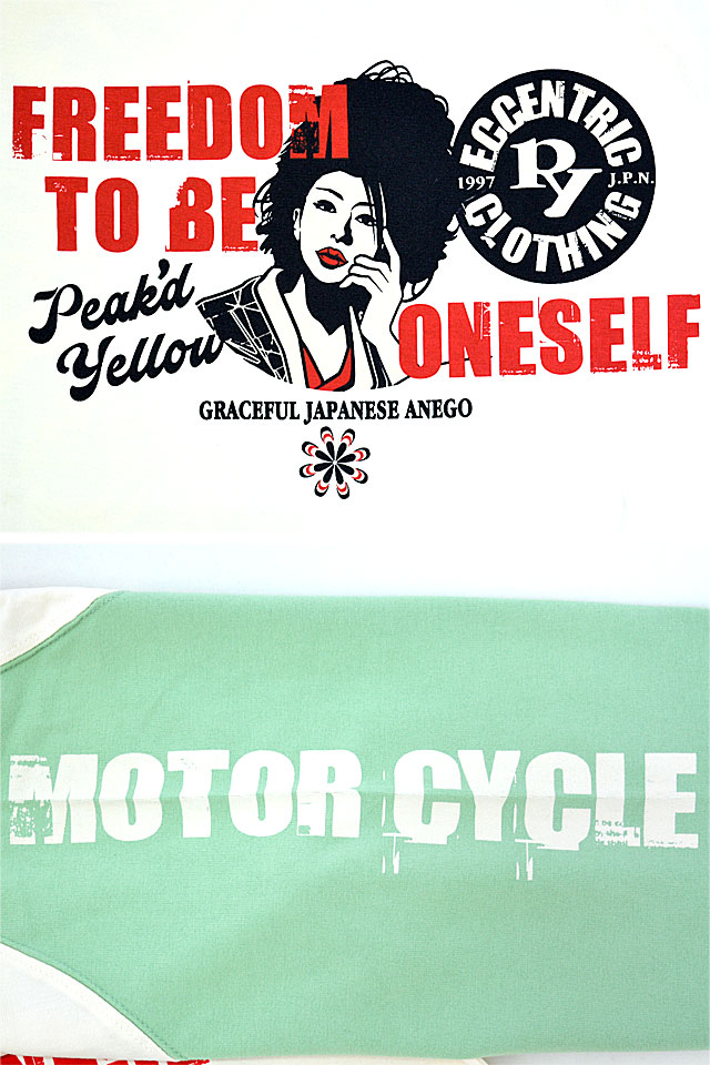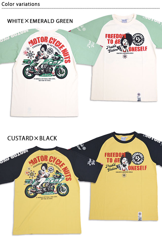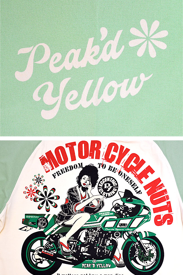 「トンガった日本人」をブランドネーミングに掲げ、オリエンタルビューティーの世界観を作品に封じ込めるピークドイエローから「バイク半袖Tシャツ(PYT-238)」のご紹介です! グリーンのバイクが特徴のレーサーレプリカにまたがった姉御のデザインの半袖Tシャツです。 背中には愛車と姉御の姿をデザイン。 フロントにも姉御のアイコンとレタードを中央にプリントしました。 左袖にはレタードを、右袖にはブランドロゴを配置。 生地はストレッチのきいた、さらりとしたものを使用。 また、今回は肩の切り替えのないラグランボディーを採用し、スポーティーに仕上げました。 | ||||||||||||||||||||