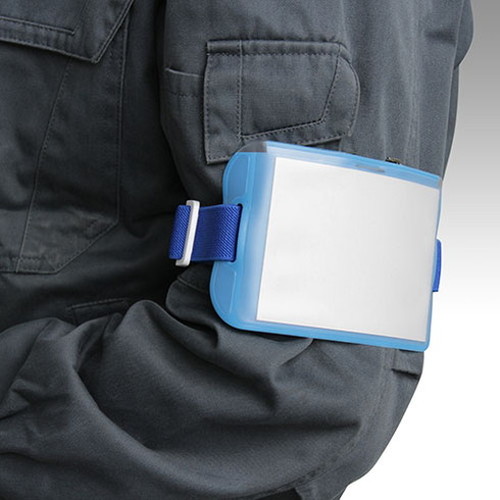 作業などの動きの邪魔にならない腕章型の名札 長さ調整ゴムバンドで腕にぴったりフィット