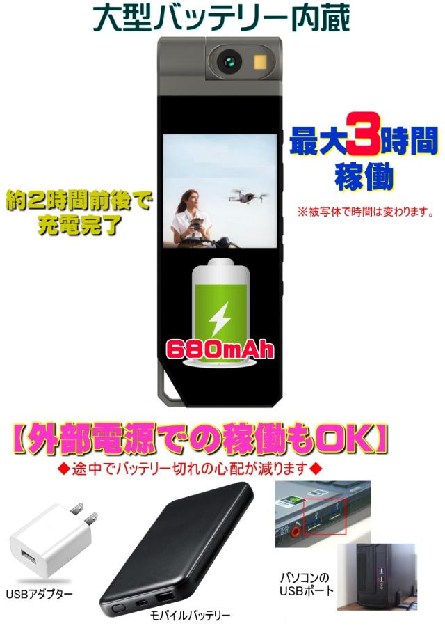 【充電録画】充電しながら録画も可能ですので電池切れの心配がありません。モバイルバッテリーを使えば稼働時間がグッと伸びます。
