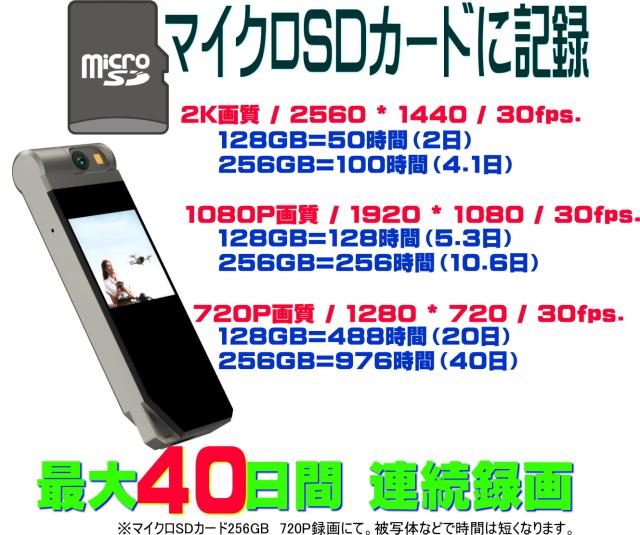 【マイクロSDカード】8GB〜256GBまで対応。録画時間は256GBで最大40日間(720P画質での録画の場合)〜最大100時間(最高画質2Kでの録画の場合)