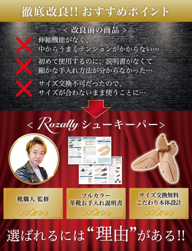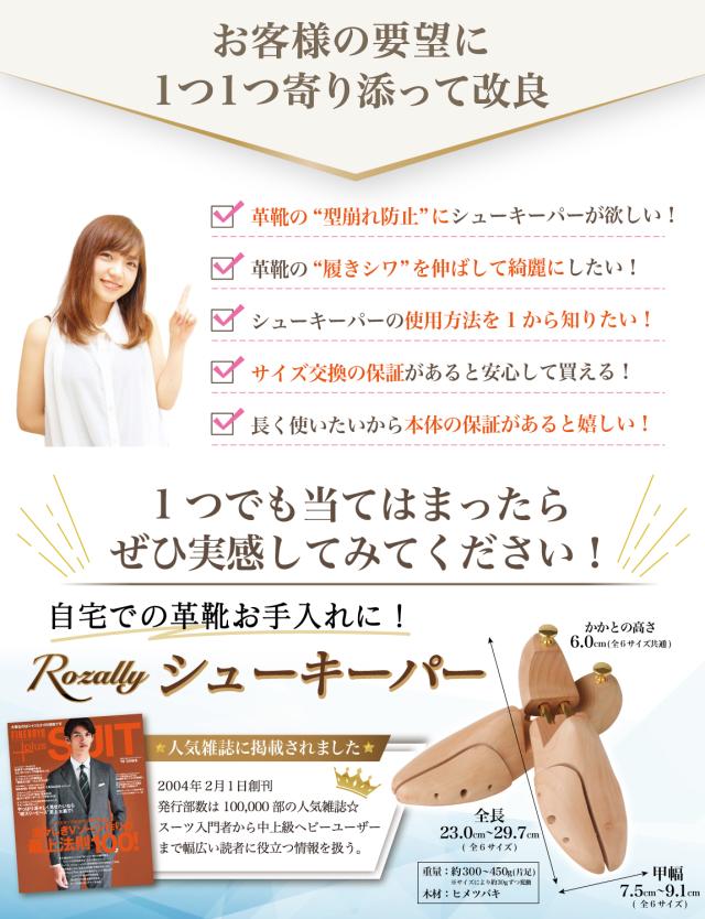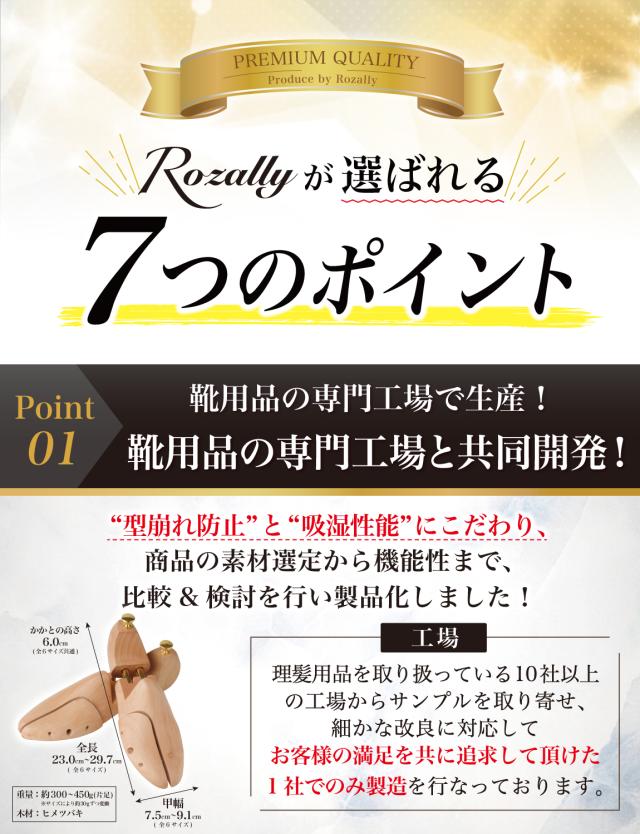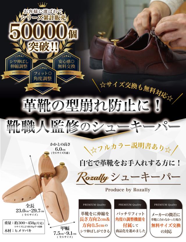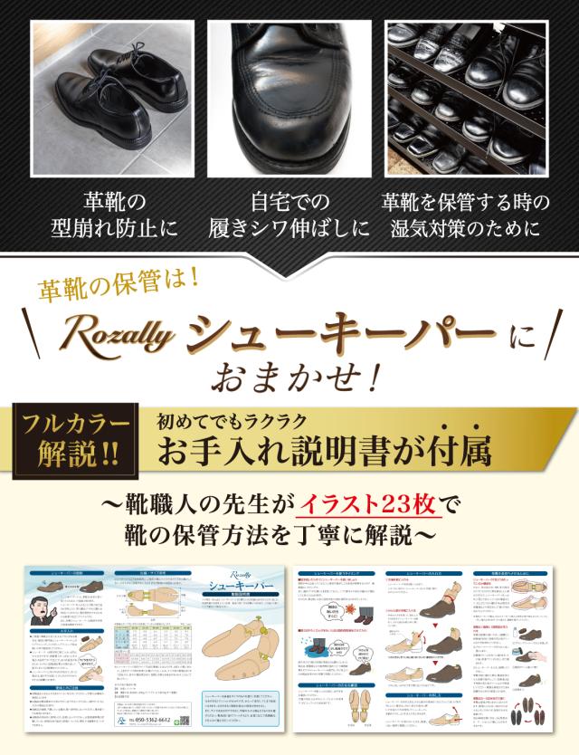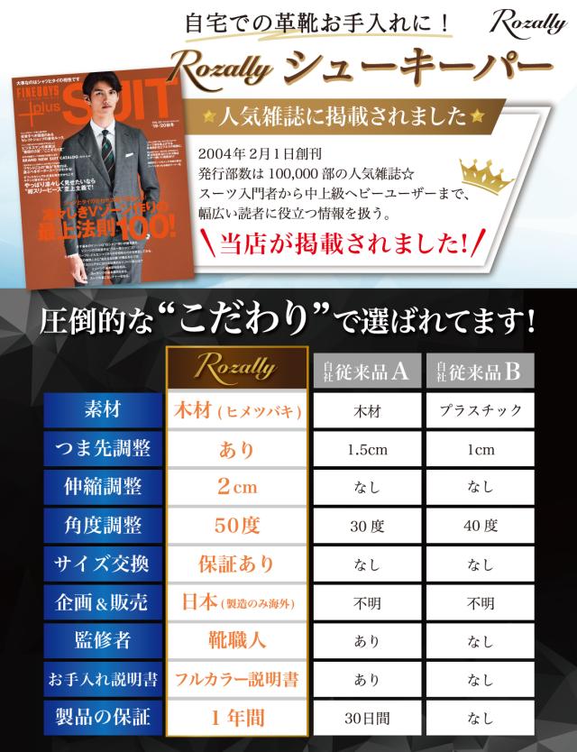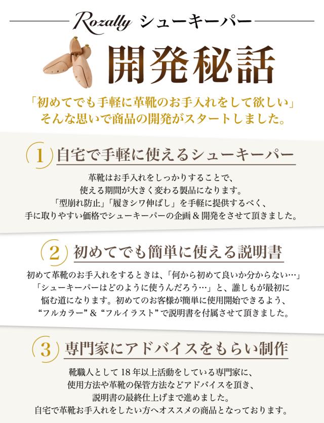 Rozally シューキーパー がついに正式販売開始。 革靴 や ビジネスシューズ の 型崩れ防止 に 木製 の シューズキーパー が欲しい…という声から生まれた 吸湿 & 防臭 にこだわりのシューキーパーです。 革靴 は履いているとどんどん 型崩れ していくため 定期的にシューキーパー (シューツリー) を使用して ”シワ伸ばし”をすることで長持ちに繋がります。 企画&設計では【靴職人】の先生からアドバイスをもらい、 初心者でも分かりやすい”シューケア”の取扱説明書を添えて製品化しました。 |