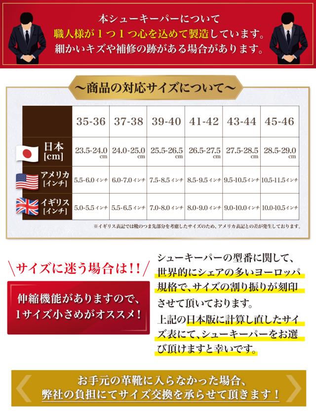 - 初めてのシューキーパーで某高級革靴メーカーのものを買おうか迷ってたところでコスパの良い本製品を見つけたのでお試しで購入しました。 バネ式と同等の価格ですがラスト型の役割をしっかりと果たしています。靴の形状に合わせやすいので靴磨きがしやすいし、夏の暑い時期でも消臭消湿効果が高いです。 今後革靴を買う時はリピートしようと思ってます。 コスパが良いので社員人1年目の人はもちろん、入学式や就活だけで革靴を使う頻度の少ない大学生にも長期保管用にオススメです。