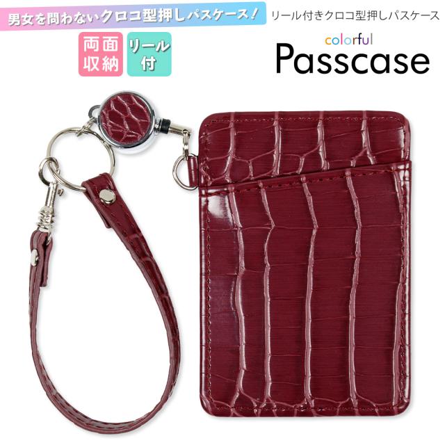 パスケース リール付き カラフルパスケース 【送料無料 お買い得 人気 最安値挑戦】クロコ柄ワイン リールパスケース 定期入れ メンズ レディース ストラップ付き 可愛い カード入れ 新品 便利 通勤 通学 安心 防犯 プレゼント ギフト