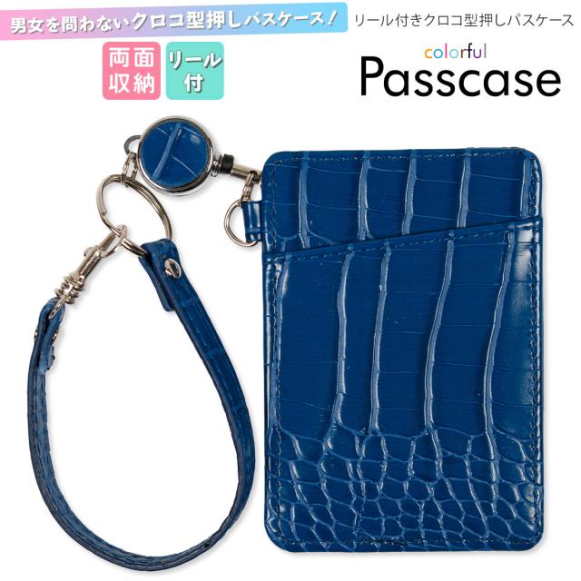 パスケース リール付き カラフルパスケース 【送料無料 お買い得 人気 最安値挑戦】クロコ柄ネイビー リールパスケース 定期入れ メンズ レディース ストラップ付き 可愛い カード入れ 新品 便利 通勤 通学 安心 防犯 プレゼント ギフト