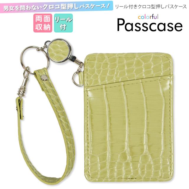 パスケース リール付き カラフルパスケース 【送料無料 お買い得 人気 最安値挑戦】クロコ柄ピスタチオ リールパスケース 定期入れ メンズ レディース ストラップ付き 可愛い カード入れ 新品 便利 通勤 通学 安心 防犯 プレゼント ギフト