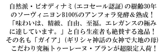 ![]() ■ぶどう品種:ソーヴィニヨン・ブラン種100% ■発酵・熟成:1000リットルの粘土製のアンフォラで発酵後、9ヶ月間シュール・リー熟成 ■平均樹齢:30年 ■土壌:砂質・粘土質土壌 ■収量:45hl/ha フランス・ロワール・トゥーレーヌ・辛口白ワイン愛好家大注目!しかも自然派・ビオディナミ(エコセール認証)の樹齢30年のソーヴィニヨン・ブラン種100%のアンフォラ発酵&熟成辛口白ワイン! その名も「ガイア」!(ギリシャ神話に登場する女神で、大地の母とされています。)造り手はアシェット・ガイド誌2023年版星付き★大注目!そのほとんどがフランス国内の愛好家98%に直行!(レストランとビストロが多い。個人のヴァン・ナチュール愛好家)、輸出2%(EU各国)! 造りたいワインは「無条件で笑顔になるワイン」であり、ここには彼女のやわらかな感性とともに、圧倒的な知見と技量を誇るエノログとしての自負も込められています。味わいは、精緻、自由、至福。エレガンスの極みに達しています。 砂質・粘土質土壌!平均樹齢30年!収量は45hl/ha!1000リットルの粘土製のアンフォラで発酵後、9ヶ月間シュール・リー熟成で造るこだわり究極トゥーレーヌ・ブランが限定で少量入荷! |