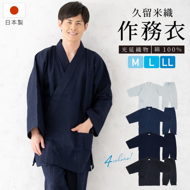 作務衣 メンズ 日本製 久留米織 光延織物 綿 男性 通年 洗える カジュアル 部屋着 普段着 和装 ルームウェア 灰色 青 紺 黒 M L LL 送料無料