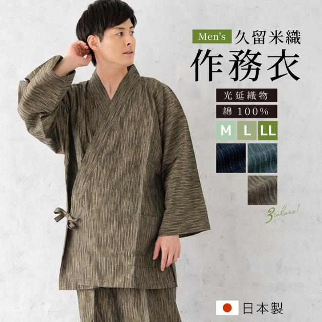 作務衣 メンズ 日本製 久留米織 光延織物 綿 男性 通年 洗える カジュアル 部屋着 普段着 和装 ルームウェア 紺 緑 茶色 雨縞 縞 ストライプ M L LL 送料無料
