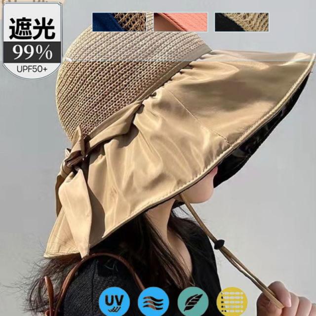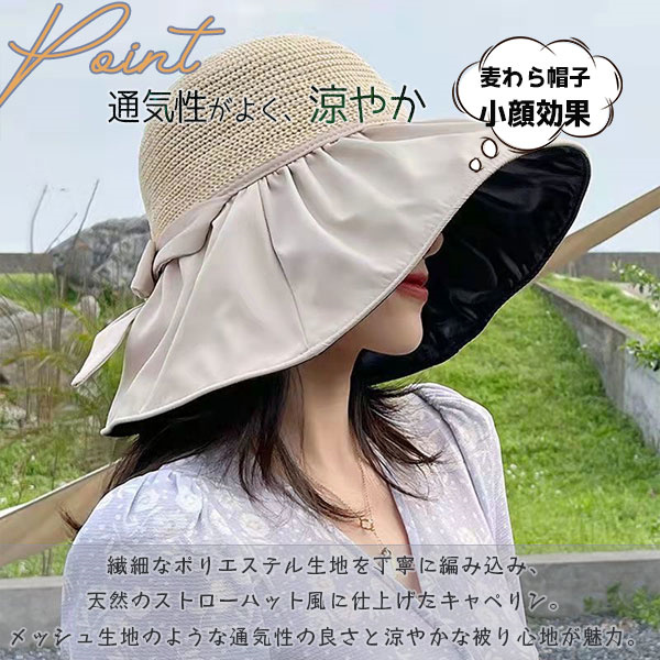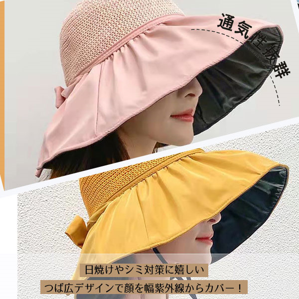ポイント超超祭 ストローハット ハット 麦わら帽子 あご紐付き リボン 夏用 キャペリン 折りたたみ レディース 帽子 つば広帽子 UV対策 涼しい 日焼け止め