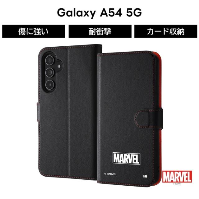 内側にはカードポケットの付いた薄くてスリムなレザーに、『マーベル』のデザインがプリントされた手帳型Galaxy A54 5G 用ケース。