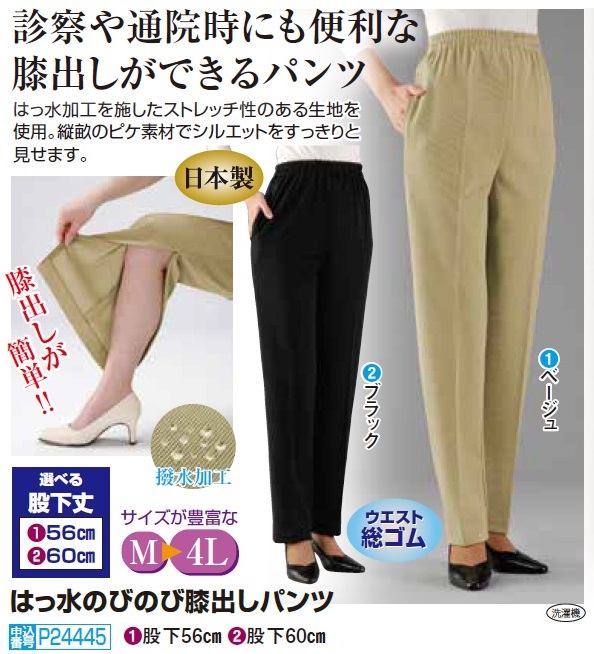 日本製 はっ水のびのび膝出しパンツ 全2色 スラックス ズボン レディース 婦人服 ミセス シニア 女性 ブラック ベージュ 黒 薄茶色 ストレートパンツ ウエストゴム 診察 通院 便利 ファッション 40代 50代 60代 70代 80代 母の日 お母さん 春物 夏物 選べる股下丈